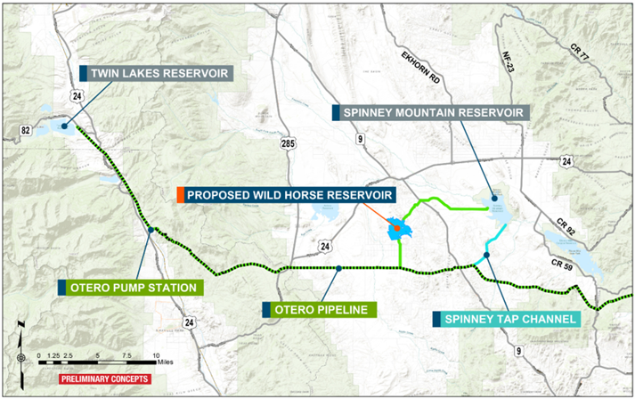To make that work, a new inlet pipeline would connect the proposed Wild Horse Reservoir project to the existing Otero pipeline, and a new outlet pipeline would convey releases to Spinney as needed. From there, water continues down the South Platte River through existing reservoirs (including Eleven Mile Reservoir) before reaching Aurora for treatment and delivery—just as it does today.